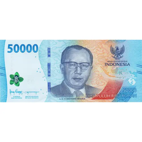 | Legenda del dritto | 50000 NEGARA KESATUAN REPUBLIK INDONESIA GUBERNUR BANK INDONESIA MENTERI KEUANGAN REPUBLIK INDONESIA Ir. H. DJUANDA KARTAWIDJAJA 50000 LIMA PULUH RIBU RUPIAH (Translation: The Unitary State of the Republic of Indonesia Governor of the Bank of Indonesia Minister of Finance of the Republic of Indonesia Fifty thousand Rupiah) |