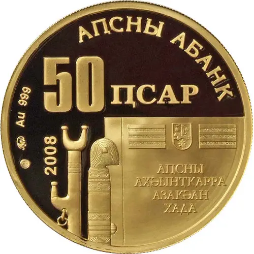 Opschrift voorzijde ММД Au 999 АҦСНЫ АБАНК 50 ҦСАР 2008 АҦСНЫ АҲӘЫНҬКАРРА АЗАКӘАН ХАДА