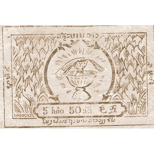 Descrizione del dritto Vessel of Constitution at the center. Lao, Latin an Chinese text below and Lao text along the edges. Printer name in the bottom.