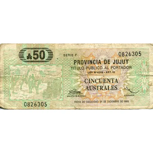 | Obverse lettering | A50 PROVINCIA DE JUJUY TITULO PUBLICO AL PORTADOR LEY No 4248 - ART. 16 CINCUENTA AUSTRALES FECHA DE CADUCIDAD: 31 DE DICIEMBRE DE 1988 (Translation: A50 Province of Jujuy Bearer public bond Law 4248, article 16 Fifty Australes Expiry date Dec. 31, 1988) |