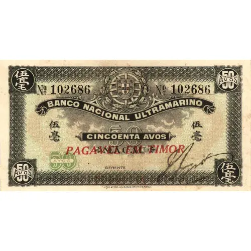 | 正面铭文 | MACAU Nº 102686 BANCO NACIONAL ULTRAMARINO PAGAVEL EM TIMOR CINCOENTA AVOS Nº 102686 |