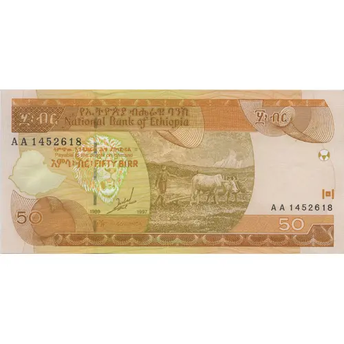 | Obverse lettering | ፶፡ብር የኢትዮጵያ ብሔራዊ ባንክ National Bank of Ethiopia ላምጪው፡አንዴከፈል፡ሕግ፡ያሰገዽዷል። Payable to bearer on demand አምሳ፡ብር፡ FIFTY BIRR (Translation: 50 Birr National Bank of Ethiopia Payable to bearer on demand Fifty Birr) |