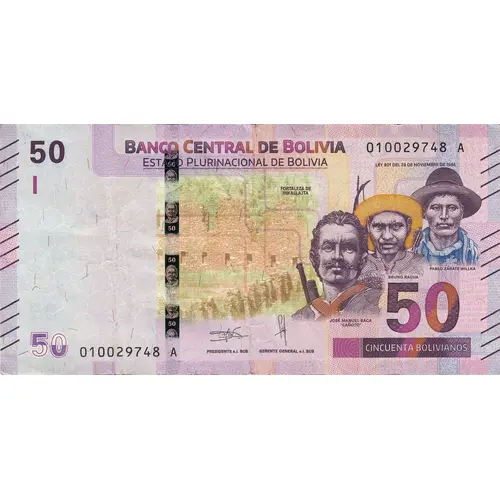 BANCO CENTRAL DE BOLIVIA ESTADO PLURINACIONAL DE BOLIVIA CINCUENTA BOLIVIANOS (Translation: Central Bank of Bolivia Plurinational State of Bolivia Fifty Bolivianos) |
