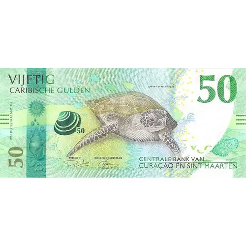 | توضیحات روی اسکناس | Dutch text; favored tellin shell in blue-to-green OVI; Chelonia mydas (green sea turtle). |