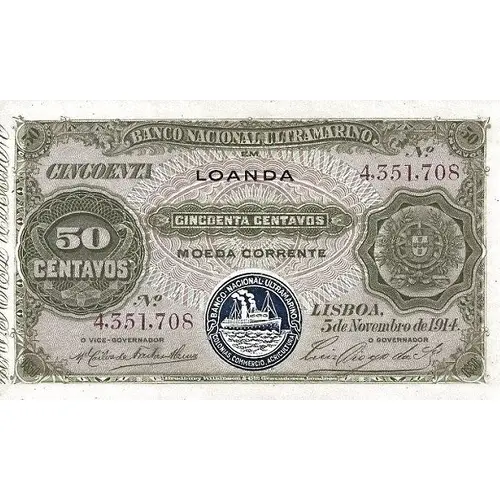 | Vorderseitenlegende | BANCO NACIONAL ULTRAMARINO EM LOANDA CINCOENTA CENTAVOS MOEDA CORRENTE (Translation: National Overseas Bank in Luanda, Fifty centavos, current currency) |