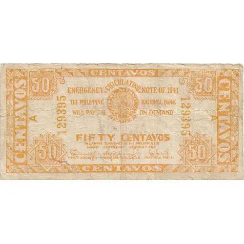 EMERGENCY CIRCULATING NOTE OF 1941 THE PHILIPPINE NATIONAL BANK WILL PAY THE BEARER ON DEMAND FIFTY CENTAVOS IN LAWFUL CURRENCY OF THE PHILIPPINES ILOILO CURRENCY COMMITTEE |