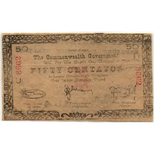 Series of 1943 The Commonwealth Government Will Pay The Bearer On Demand FIFTY CENTAVOS In Lawfull Currency of the Philippines Free Samar Currency Board Prov. Fiscal Member Prov. Auditor Chairman Prov. Treasurer Member 50 C. |