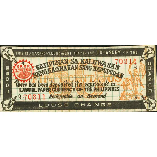 THIS IS AN ACKNOWLEDGEMENT THAT IN THE TREASURY OF THE KATIPUNAN SA KALUWASAN SANG KA-ANAKAN SANG KAPUPUD-AN FIFTY CENTAVOS THERE HAS BEEN DEPOSITED ITS EQUIVALENT IN LAWFULL PAPER CURRENCY OF THE PHILIPPINES REDEMABLE ON DEMAND LOOSE CHANGE |