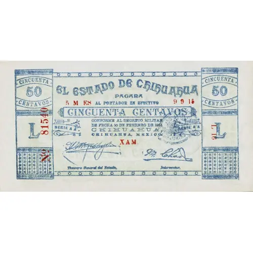 | Leyenda del anverso | CINCUENTA CENTAVOS 50 EL ESTADO DE CHIHUAHUA PAGARA AL PORTADOR EN EFECTIVO CINCUENTA CENTAVOS CONFORME AL DECRETO MILITAR DE FECHA 10 DE FEBRERO DE 1914 CHIHUAHUA, CHIHUAHUA, MEXICO. (Translation: Fifty Cents The State of Chihuahua will pay to the bearer in cash Fifty Cents conforming to the military decree dated 10 February 1914.) |