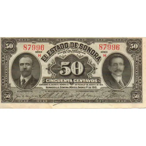 | Ön yüz lejandı | EL ESTADO DE SONORA PAGAR AL PORTADOR EN EFECTIVO CINCUENTA CENTAVOS (Translation: State of Sonora Will Pay the Bearer Cash Fifty Centavos) |