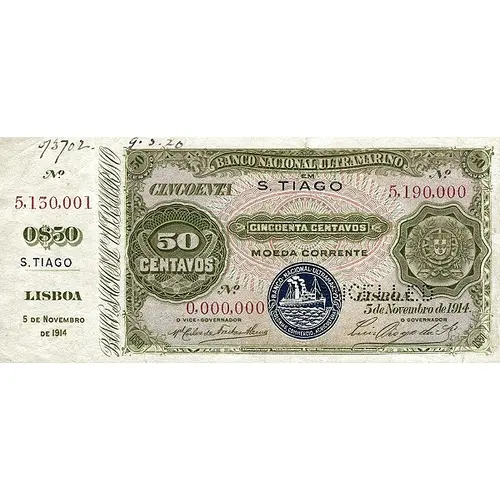 | Obverse lettering | BANCO NACIONAL ULTRAMARINO EM S. TIAGO CINCOENTA CENTAVOS MOEDA CORRENTE LISBOA, 5 de Novembro de 1914. (Translation: National Bank Overseas in S. Tiago Fifty Cents in currency Lisbon, November 5, 1914.) |