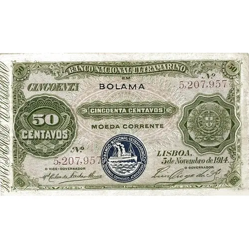 | Legenda del dritto | BANCO NACIONAL ULTRAMARINO EM BOLAMA CINCOENTA CENTAVOS MOEDA CORRENTE LISBOA, 5 de Novembro de 1914. (Translation: National Bank Overseas in Bolama Fifty Cents in currency Lisbon, November 5, 1914.) |