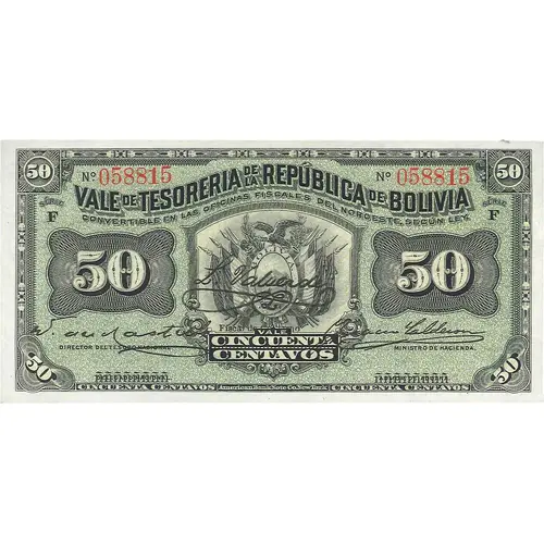 | Ön yüz lejandı | N° 058815 VALE DE TESORERIA DE LA REPÚBLICA DE BOLIVIA SÉRIE F CONVERTIBLE EN LAS OFICINAS FISCALES DEL NOROESTE, SEGÚN LEY 50 Fiscal del Gobierno VALE CINCUENTA CENTAVOS DIRECTOR DEL TESORO NACIONAL. MINISTRO DE HACIENDA. (cancelled) DELEGADO NACIONAL. ADMOR. DE ADUANA. American Bank Note Co. New York (Translation: Treasury Coupon of the Republic of Bolívia Serie F Convertible in the northwest tax offices, according to the law 50 Fiscal of Government Worth Fifty Cents National Treasury Director, Treasury Minister, National Delegate, Custom House Administrator. American Bank Note Co. New York) |