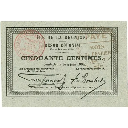 | Obverse lettering | ÎLE DE LA RÉUNION Tresor Colonial Décret du 2 Mai 1879 BON POUR CINQUANTE CENTIMES Saint-Denis, le 4 juin 1884. La contre-valeur en espèces est déposée an Trésor (Translation: Island of Reunion Colonial Treasury Decret May 2, 1879 Fifty Cents Saint-Denis, June 4, 1884. The cash equivalent is deposited in the Treasury) |