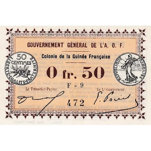 50 CENTIMES EXTRAIT DU DÉCRET DU 11 FÉVRIER 1917 50 CENTIMES 50 CENTIMES Les bons de caisse émis auront cours forcé soit dans toute l`étendue de la Colonie, soit dans certaines localités désignées par le Lieutenant-Gouverneur de la Colonie intéressée et ne pourront, en aucun cas, circuler hors de cette Colonie ou de ces localités; ils seront remboursés en espèces dans un délai de deux ans, lequel commencera à courir à partir de la cessation des hostilités. Ceux qui auront contrefait ou falsifié les bons de caisse ou fait usage de ces bons contrefaits ou falsifiés seront poursuivis conformément aux lois et punis de travaux forcés à perpétuité ou de l`emprisonnement perpétuel, suivant le statut personnel des délinquanis. Ce bon de caisse a cours forcé dans toute la Colonie. 50 CENTIMES Gorée. — Imp. Gouvᵗ Génᵃˡ. |