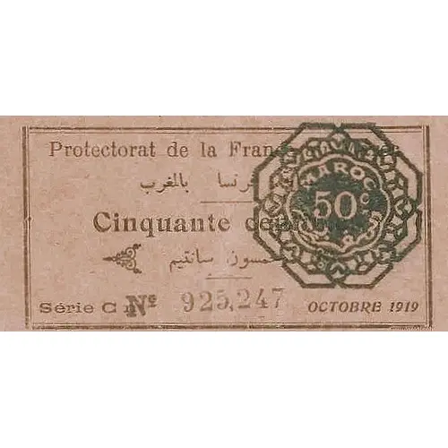 | Obverse lettering | PROTECTORAT DE LA FRANCE AU MAROC CINQUANTE CENTIMES |