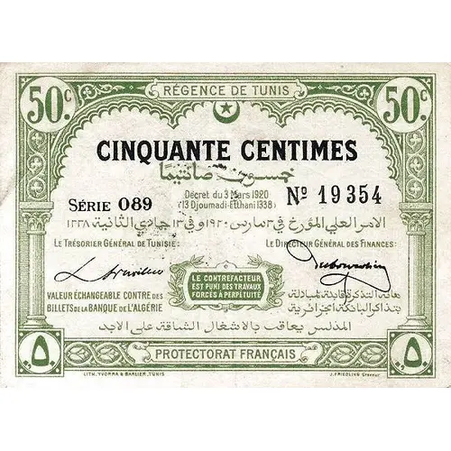REGENCE DE TUNIS CINQUANTE CENTIMES DÉCRET DU 3 MARS 1920 13 DJOUMADI-ETTHANI 1338 VALEUR ÉCHANGEABLE CONTRE DES BILLETES DE LA BANQUE DE L`ALGÉRIE LE CONTREFACTEUR EST PUNI DES TRAVAUX FORCES A PERPÉTUITÉ PROTECTORAT FRANÇAIS LITH. YVORRA & BARLIER_TUNIS J. FRIEDLING Graveur |