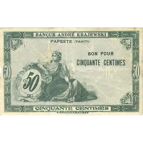| Vorderseitenlegende | BANQUE ANDRÉ KRAJEWSKI PAPEETE (TAHITI) BON POUR CINQUANTE CENTIMES cts 50 CINQUANTE CENTIMES A. CARLISLE & CO. S.F. (Translation: André Krajewski Bank Papeete (Tahiti) good for Fifty Cents A. Carlisle & Co. S.F.) |