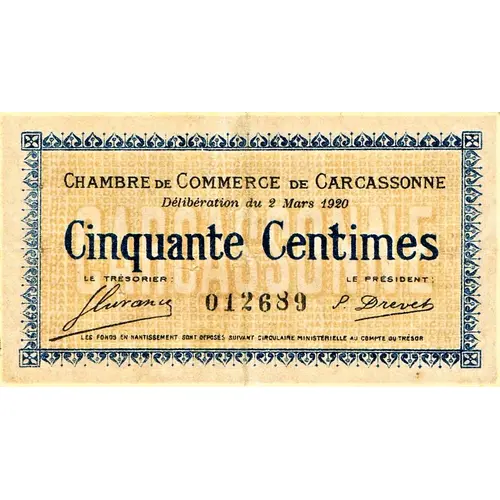 | 正面铭文 | CHAMBRE DE COMMERCE DE CARCASSONNE Délibération du 2 mars 1920 CINQUANTE CENTIMES Le Trésorier 012689 Le Président |