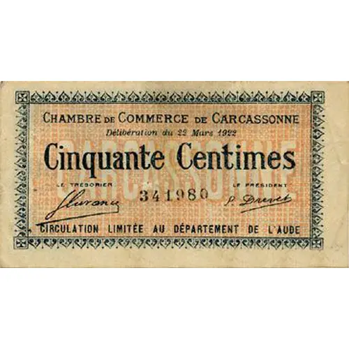 CHAMBRE DE COMMERCE DE CARCASSONNE Délibération du 22 Mars 1922 Cinquante Centimes LE TRÉSORIER 341980 LE PRÉSIDENT CIRCULATION LIMITÉE AU DÉPARTEMENT DE L`AUDE |