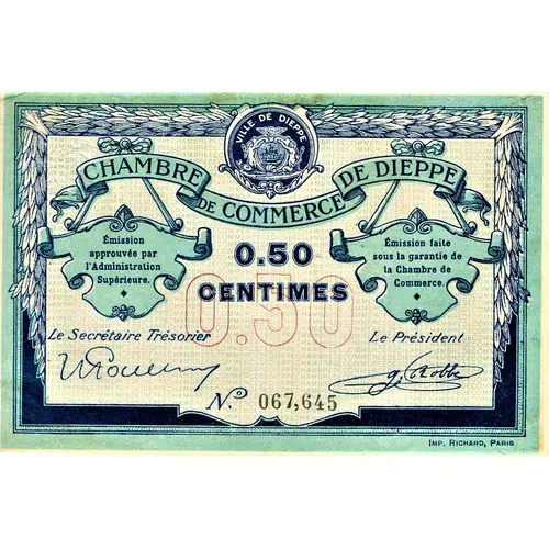 | Надписи лицевой стороны | VILLE DE DIEPPE CHAMBRE DE COMMERCE DE DIEPPE 0,50 CENTIMES Emission approuvée par l`Administration Supérieure Emission faite sous la garantie de la Chambre de Commerce. Le Secrétaire Trésorier Le Président N° 067,645 IMP. RICHARD, PARIS |