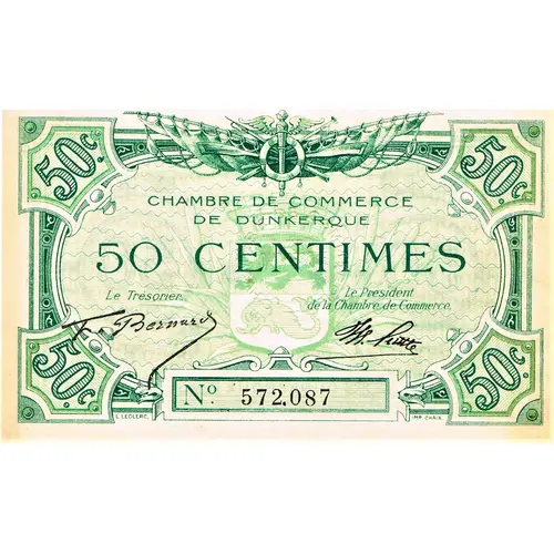 | Legenda do anverso | 50c 50c 50c 50c CHAMBRE DE COMMERCE DE DUNKERQUE 50 CENTIMES Le Trésorier Le Président de la Chambre de Commerce N° 572,087 L. LECLERC. IMP. CHAIX. |