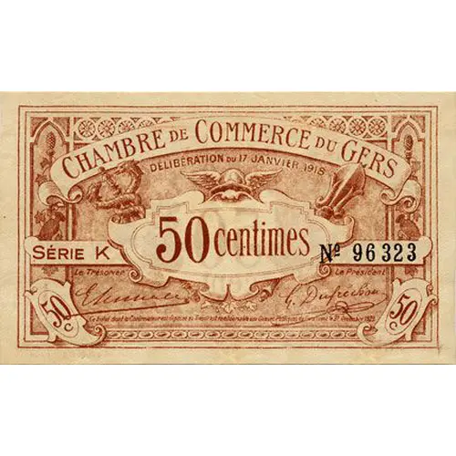 CHAMBRE DE COMMERCE DU GERS DELIBERATION DU 17 JANVIER 1918 SERIE K | 50 centimes | N°96323 50c | 50c Le trésorier Le Président J.E.LACOSTE Inv. | E.COLLASSON. Grav. | BOUQUET & Co Imr AUCH. |