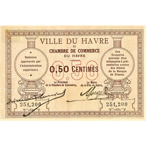 | Legenda del dritto | VILLE DU HAVRE CHAMBRE DE COMMERCE DU HAVRE 0,50 CENTIMES Emission approuvée par l`Administration supérieure. Ces coupures peuvent être échangées à présentation contre des Billets de la Banque de France. Le Président de la chambre de Commerce Le Maire de la Ville du Havre 251,200 251,200 |