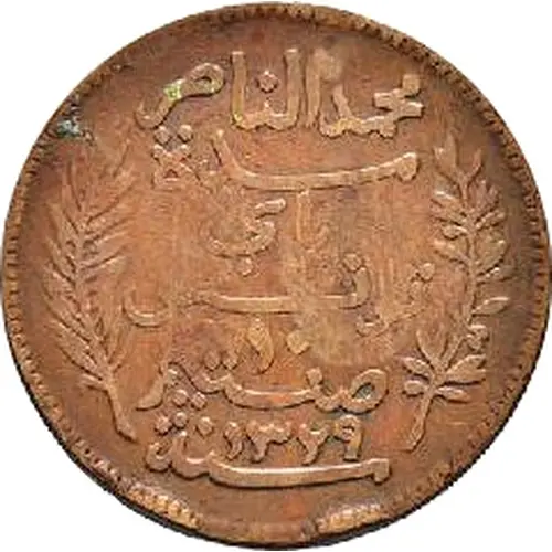 | Надписи аверса | محمد الناصر مدة باي تونس ١٠ صنتيم ١٣٢٩ سنة (Translation: Muhammed Al-Nasir Muddat Bey of Tunis 10 Centimes Year 1329) |