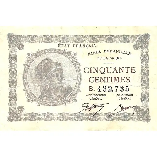 ETAT FRANCAIS MINES DOMANIALES DE LA SARRE FRANC | FRANC 0.50 | 0.50 CES BILLETS DONT LA CONTREVALEUR EST DEPOSEE AU TRESOR FRANCAIS SONT REMBOURSABLES PAR LE CAISSIER GENERAL DES MINES DOMANIALES DE LA SARRE. LEUR REMBOURSEMENT DEVRA ETRE DEMANDE AVANT LE 1er JANVIER 1930 |