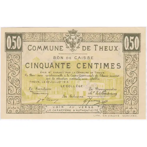 Obverse lettering 0,50 0,50 COMMUNE DE THEUX (ligne) BON DE CAISSE CINQUANTE CENTIMES ÉMIS ET GARANTI PAR LA COMMUNE DE THEUX. Ce Bon sera remboursable à la Caisse Communale de Theux aussitôt que la situation normale sera rétablie. THEUX, LE 27 JUILLET 1915 LE COLLÈGE : Le Secrétaire Le Bourgmestre (signature) (signature) Les Echevins, (signature) (signature) (dans un cadre centré :) VOIR AU VERSO LE CARACTÈRE D`AUTHENTICITÉ LITH. CH. VINCHE . VERVIERS.
