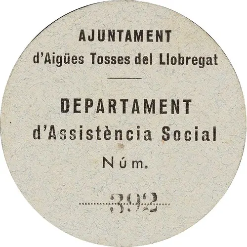 | Leyenda del anverso | AJUNTAMENT d`Aigües Tosses del Llobregat DEPARTAMENT d`Assistència Social Núm. 392 (Translation: City Council of Aigües Tosses del Llobregat Department of Social Assistance) |