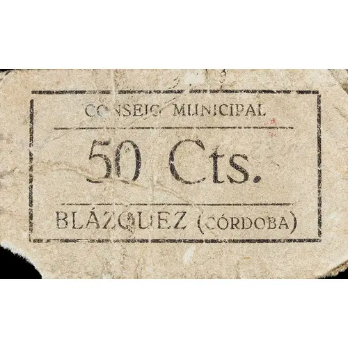 | 表面の銘文 | CONSEJO MUNICIPAL 50 Cts. BLÁZQUEZ (CÓRDOBA) (Translation: Municipal Council 50 Centimos Blázquez (Córdoba)) |