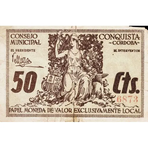 | Opis líce | CONSEJO MUNICIPAL / CONQUISTA -CORDOBA- 50 Cts. PAPEL MONEDA DE VALOR EXCLUSIVAMENTE LOCAL (Translation: Municipal Council / Conquista -Córdoba- 50 Centimos Paper money of exclusively local value) |