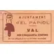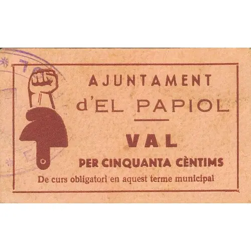 AJUNTAMENT d`EL PAPIOL VAL PER CINQUANTA CÈNTIMS De curs obligatori en aquest terme municipal (Translation: City Council of El Papiol Valid for Fifty Centimos Of mandatory cours in this municipal term) |