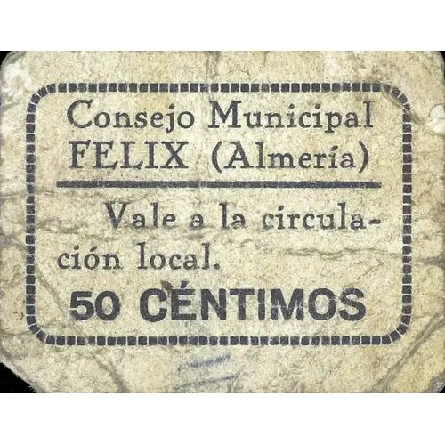 Consejo Municipal FELIX (Almería) Vale a la circulación local. 50 CÉNTIMOS (Translation: Municipal Council Felix (Almeria) Valid for local circulation. 50 Centimos) |