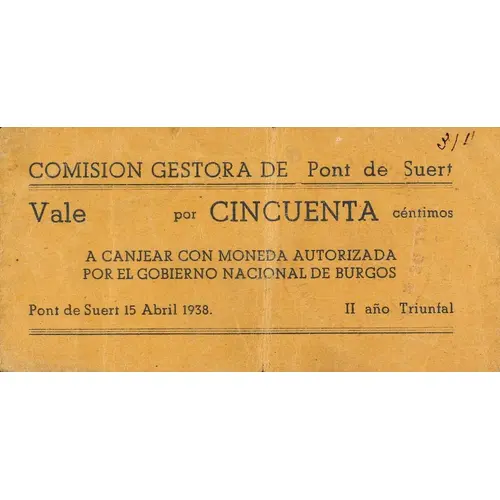 | Ön yüz lejandı | COMISION GESTORA DE Pont de Suert Vale por CINCUENTA céntimos A CANJEAR CON MONEDA AUTORIZADAPOR EL GOBIERNO NACIONAL DE BURGOS Pont de Suert 15 Abril 1938. II año Triunfal (Translation: Management Commission of Pont de Suert Voucher for Fifty Centimos To be exchanged with currency authorized by the National Government of Burgos Pont de Suert April 15, 1938. 2nd Triumphal year) |