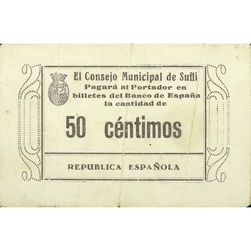 El Consejo Municipal de Suflí Pagará al portador en billetes del Banco de España la cantidad de 50 céntimos REPUBLICA ESPAÑOLA (Translation: The Municipal Council of Suflí Will pay the bearer in banknotes of the Bank of Spain the amount of 50 Centimos Spanish Republic) |
