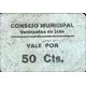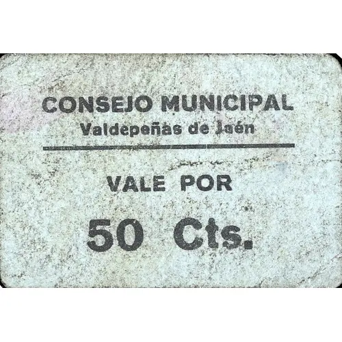 | Legenda do anverso | CONSEJO MUNICIPAL Valdepeñas de Jaén VALE POR 50 Cts. (Translation: Municipal Council Valdepeñas de Jaén Voucher for 50 Centimos) |