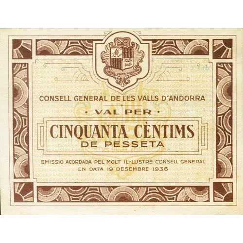 | Leyenda del anverso | CONSELL GENERAL DE LES VALLS D`ANDORRA VAL PER CINQUANTA CÈNTIMS DE PESSETA EMISSIÓ ACORDADA PEL MOLT IL·LUSTRE CONSELL GENERAL EN DATA 19 DESEMBRE 1936 (Translation: General Council of the Valleys of Andorra Valid for 50 Centimos of Peseta Issue agreed by the very illustrious General Council on December 19, 1936) |