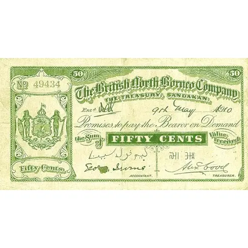 | 正面铭文 | The British North Borneo Company THE TREASURY, SANDAKAN. Promises to pay the Bearer on Demand the Sum of TWENTY FIVE CENTS Value recived 半元 |