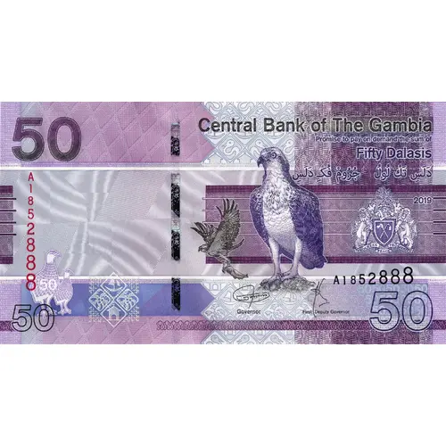 | Vorderseitenlegende | Central Bank Of The Gambia Promise to pay on demand the sum of Fifty Dalasis |