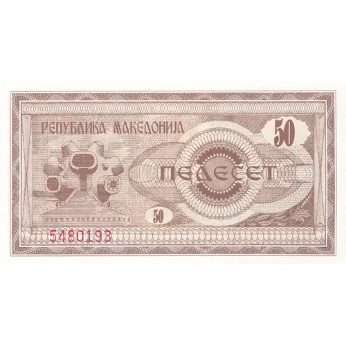 | نوشتههای پشت اسکناس | РЕПУБЛИКА МАКЕДОНИЈА 50 ПЕДЕСЕТ (Translation: Skopje 1992 National Bank of Macedonia 50 Fifty 50) |