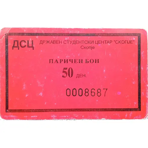 | Légende de l’avers | ДCЦ ДPЖABEН CTYДEHTCКИ ЦEHTAP `CКOПJE` CКOПJE ПAPИЧEH БOH 50 ДEH. 0008687 |