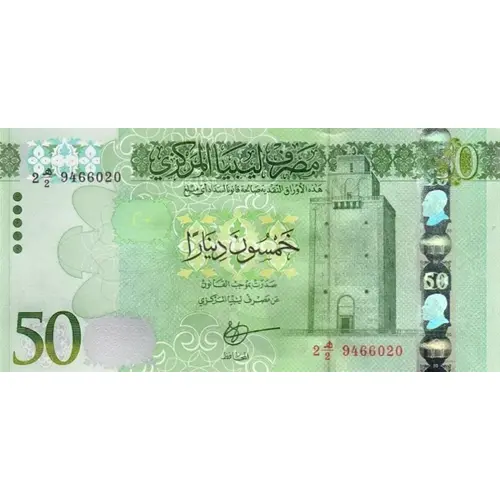 | نوشتههای پشت اسکناس | 50 CENTRAL BANK OF LIBYA FIFTY DINARS 50 |