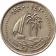 | Ön yüz açıklaması | Dates on top. Old emblem of Qatar consisting of a sailing ship (dhow) sailing on waves beside an island with two palm trees. |