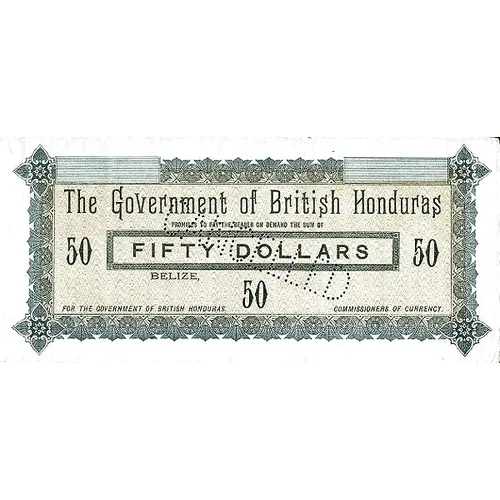 | Obverse lettering | The Government of British Honduras PROMISE TO PAY THE BEARER ON DEMAND THE SUM OF FIFTY DOLLARS BELIZE FOR THE GOVERNMENT OF BRITISH HONDURAS COMMISSIONERS OF CURRENCY 50 |