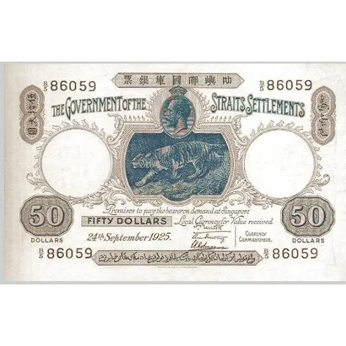 | Leyenda del anverso | THE GOVERNMENT OF THE STRAITS SETTLEMENTS Promises to pay the bearer on demand at Singapore FIFTY DOLLARS Local Currency for Valued received Currency commissioner |