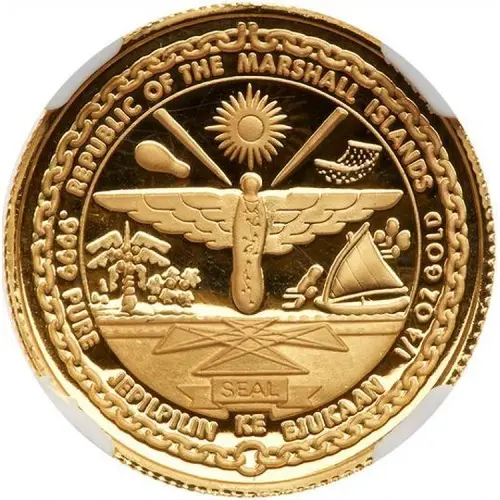 | Obverse lettering | REPUBLIC OF THE MARSHALL ISLANDS .9999 PURE JEPILPILIN KE EJUKAAN 1/4OZ GOLD SEAL |