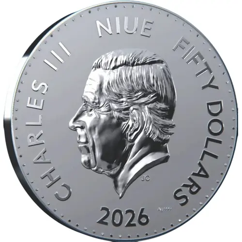 | Obverse lettering | CHARLES III NIUE FIFTY DOLLARS JC Ag 999 2026 |